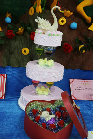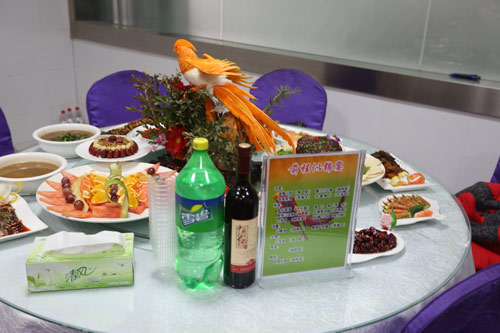 大厨精英专业1303班为此次毕业宴席做了充足的准备,他们制作了的展台迎合了羊年的主题“三羊开泰”,四桌宴席分别为“迎宾宴”“谢师宴”“大展宏图宴”和“前程似锦宴”表达了他们对毕业的美好祝愿和对学校领导和老师的感激之情。
