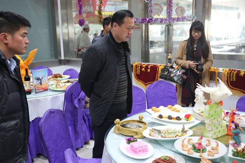 大厨精英专业1303班邀请了学校老师蚩建亭和刘海宾对他们的宴席做出点评,跟以往的宴席不同,1303班的宴席格外精致美轮美奂,面塑玫瑰花、荷花、牡丹花,糖艺作品白天鹅和骏马,以及雕刻作品鸽子,雄鹰都没他们拿来装扮宴席,每一道菜肴都精致无比,让人赏心悦目,因此他们的宴席也得到了两位教师的一直好评,当然,他们也给即 将毕业的他们一些美好的祝愿和好的建议。