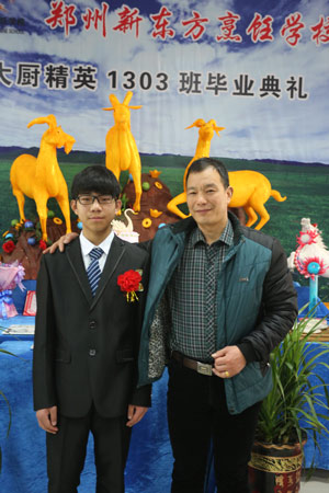 2015年1月13日,在郑州新东方烹饪学校宴会厅,大厨精英专业1303班毕业典礼正在如火如荼地进行。经过精心筹备,郑州新东方大厨精英专业1303班的全体学生用四桌饕餮盛宴和一个富丽堂皇的展台为自己两年的学习生涯画上圆满句号。郑州新东方烹饪学校领导出席了本次宴席,并为学生送上了美好的祝愿。